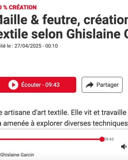 Ecouter le podcast sur RFI. Voir la vidéo sur instagram. RFI 100% création par Maria Afonso. Maille & feutre, création et innovation textile selon Ghislaine Garcin.Diffusé le 27 avril 2025.