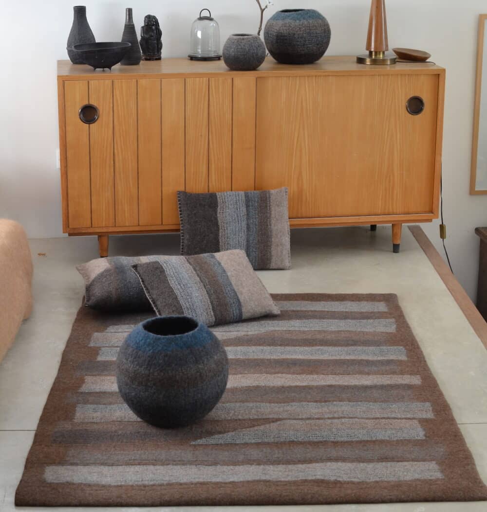 A unique textured felt due to the presence of the knitting. Our handmade rugs or wall hangings combine two techniques, knitting and wool felt. The production method, entirely handmade in a limited edition, and the materials used respect the environment. They can be made to measure in different colours, shapes and sizes to fit any space.